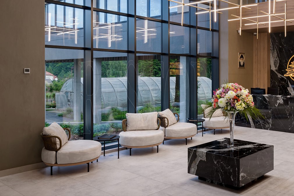 Крісло в лаунджевій посадці (глибша посадка за рахунок більшого нахилу спинки) добре впишеться в хол бізнес центру, салону краси або пансіонату для відпочинку.