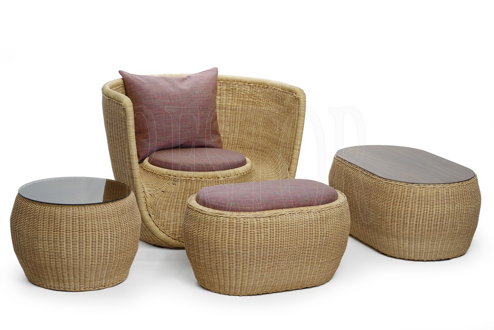 Плетений штучним ротангом пуф - підставка чудово гармонує з кріслом Лейзі зі своєї колекції. Меблі компанії Restor доукомплектовуються мякими подушками з різними типами тканини та їх кольорами.
