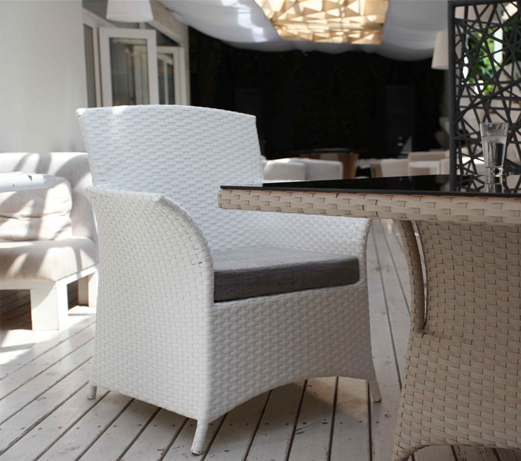 Аристократична модель крісла Патіо - дизайнерське плетіння. Плавно вигнута форма спинки та підлокітників із низько заплетеною лінією. Примітний вид передньої нижньої області оформлено півколом, для зручнішого розташування за столом.   Меблі серії "Патіо" чудово почуваються в саду, на …