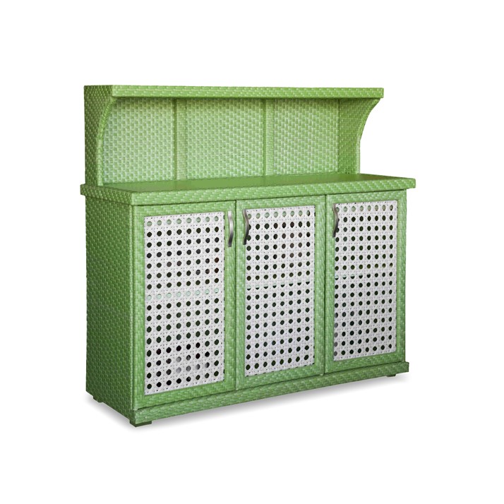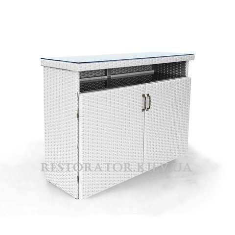 Тумба из полиротанга, состоящая из 3х дверей. Ажурно сплетенные дверцы узором из восьмигранников. Плетеная столешница декорирована стеклом (уровень прозрачности, заказчик может скорректировать). Внутренняя и нижняя полка выполнена так же из стекла.